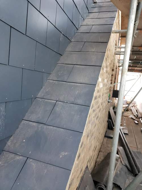Our clients A North London building company that specialises in Loft conversions had awarded us the contract for the Eternit roof covering along with membranes ,lead work and termination detailing. This roof worked out at around 70 square metres and took from start to finish 6 days for a 2 man team this included the fitting of two Velux windows a twenty metre flat roof (three layer built up system and vertical slating with mitred hips to the dormer. The works were carried out under a temporary roof to keep the elements out. The slates used were Eternit which are slightly better quality than the other choices of man made fibre cement slates that are on the market. Any new roof that we install comes with a written insurance backed guarantee. The two man team included myself and I thoroughly enjoyed carrying out the project and overseeing that the finish is to the standard that my clients have come to expect. Many of my clients and business associates I have built up a long working relationship with and some in excess of twenty years so the finished product is always very important to us. Our workmanship on new roofs carry a 10 year material and labour guarantee which is insurance indemnified